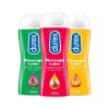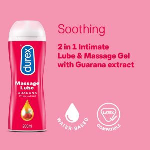 - Durex Play Sensual Massage 2-in-1 is a completely safe lubricant gel for smooth and comfortable love-making with your partner. Play Sensual Massage gel contains Ylang Ylang, a flower grown in areas of rainforests within the islands of the Pacific Ocean, which is believed to have strong sensual and aphrodisiac effects. Durex has a range of personal lubricants, ideal to experiment with, until you find the one that suits you best. From time to time, your body might not always produce as much moisture as you need. The lubricant can be used to ease vaginal dryness and is ideal for massages. Being water-soluble, they don’t stain and are is easily washable. You can also indulge in Durex’s Play Vibrations ring to make love making more exciting!